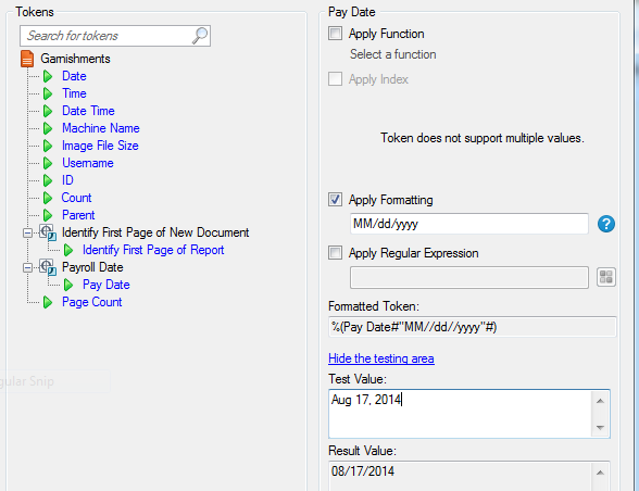 Okay, I am still learning so any help would be much appreciated.  Okay, I have a session that I'm trying to change the "Pay Date" from Dec 1, 2013 to 12/01/2013.  I have inserted a snip it of my task pane and my configuration pane.  I am using a OCR zone to read date.  Then I'm using a token dialog, but not working. When test after apply formatting, it works.   Should I be using a substitution process or pattern matching?  The two get me a little confused and when and when not to use.  I thought I could "add" a token with Token Dialog.  I am running QF 9.