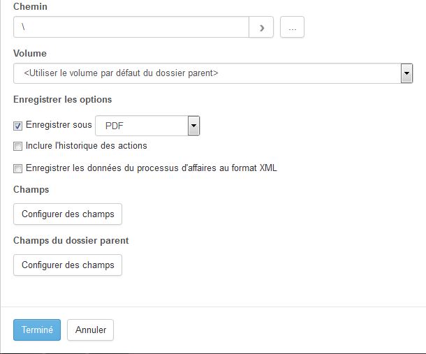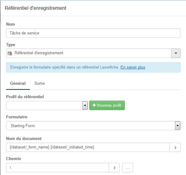 I didn't made any changes on the Publish page so it should be on the Service task. I sent to you a screenshot from Service task settings because there are few fields that I don't know how to set and for what they are used for : "Profil du référentiel" and "Chemin". In english it should be something like "Repository profil" and "Path". For both fields I let them with no values. In the "Service task" settings there are two tab "General" (see on attachment) and "Output" : I didn't set any params on the Output part.