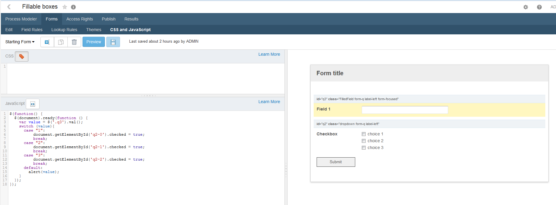 Okay so this this is what I have put together and seems to work in my small test environment. I will be adapting it to the full evaluation form over the course of the next couple days. Uses the CSS types of filledfield and dropdown as listed by Kenneth above and uses a change field trigger on the employee ID field that is filled by the initial stored procedure so that all the other single line "filledfield"s have values when the actual radio button/checkboxes are populated. I have Yes-No, A-B-C, A-B-C-D-E, and A-B-C-D-E-F-G questions through out the form that have the "dropdown". I hope this helps others that need this type of solution. I have chosen to use radio buttons to keep from having extra code to limit the number of checkboxes that can be clicked at a time. We are looking for a single response from these questions that allow us to change values as needed with out having the client choose every question over to update the database.