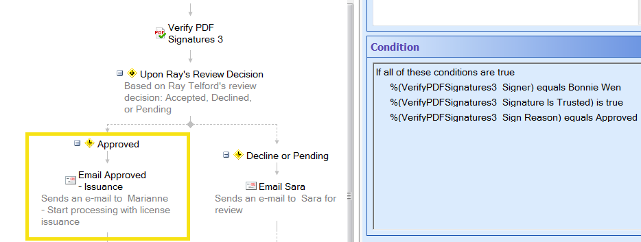 Thank you for your reply. I have redesigned my workflow with Verify PDF Signature. I used token to query Verify PDF Signature - Sign Reason, but still could not use the Sign Reason to trigger workflow. Still everything goes to the decline/pending branch. I cannot upload .wfl file here. Can I email the workflow to you, so you can help me take a closer look? Thanks!