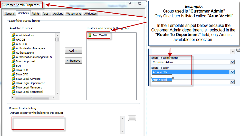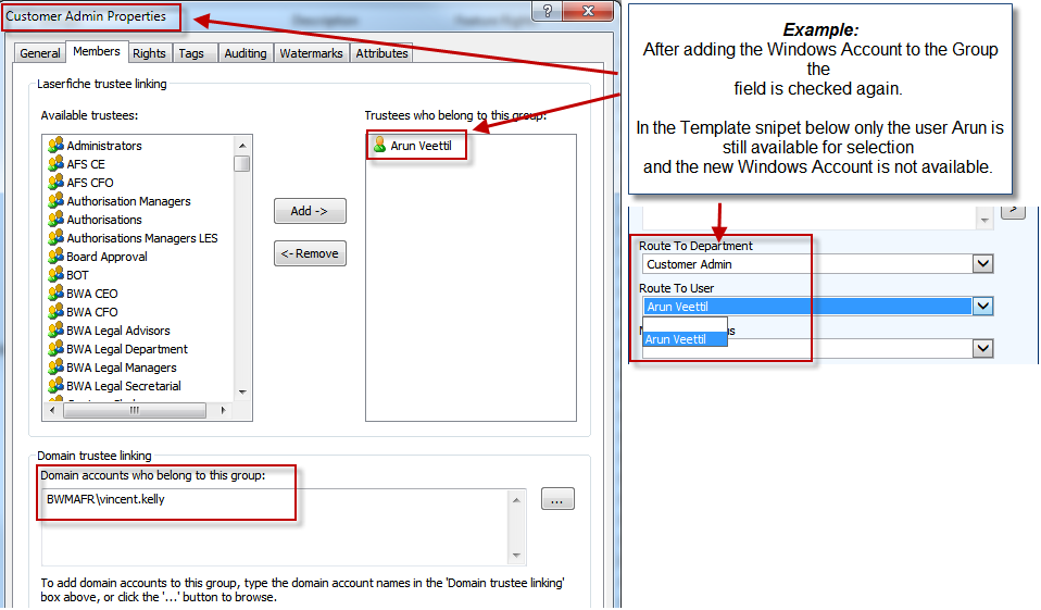 Below is screenshots indicating how the Dynamic Field is used for user selection. Initially only the normal Laserfiche Account and then After that once a Windows Account has been added to the Group.