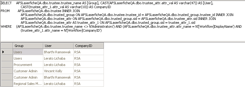 CREATE VIEW [dbo].[Trustees_ViewDept1] AS SELECT a.trustee_name AS [User], c.trustee_name AS [Group], AFSLaserficheQA.dbo.trustee_attr.attr_name, CAST(AFSLaserficheQA.dbo.trustee_attr.attr_val AS varchar(10)) AS attr_val FROM AFSLaserficheQA.dbo.trustee AS a INNER JOIN AFSLaserficheQA.dbo.grouplist AS b ON b.member_id = a.trustee_id INNER JOIN AFSLaserficheQA.dbo.trustee AS c ON b.group_id = c.trustee_id INNER JOIN AFSLaserficheQA.dbo.trustee_attr ON a.sid = AFSLaserficheQA.dbo.trustee_attr.sid WHERE (c.trustee_name <> 'Administrators') AND (c.trustee_name IN ('Customer Admin', 'Procurement', 'Manual Transactions')) AND (AFSLaserficheQA.dbo.trustee_attr.attr_name = '[Workflow]CompanyID') GO