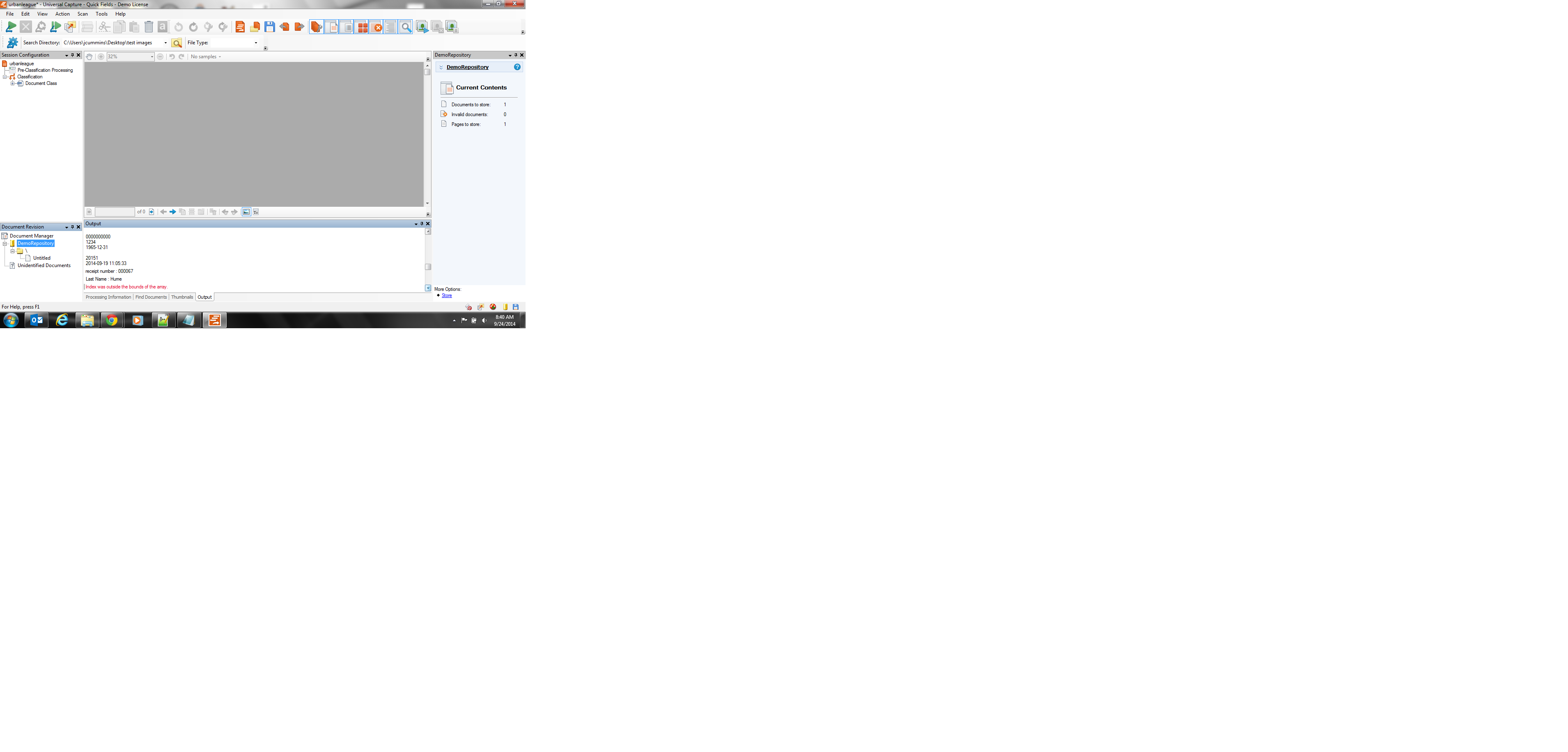 We looked further at your session and the error you are receiving ("Index was outside the bounds of the array") is being returned because you do not have an input value for the "first name" pattern match. When you add in your barcode token the error should be resolved.