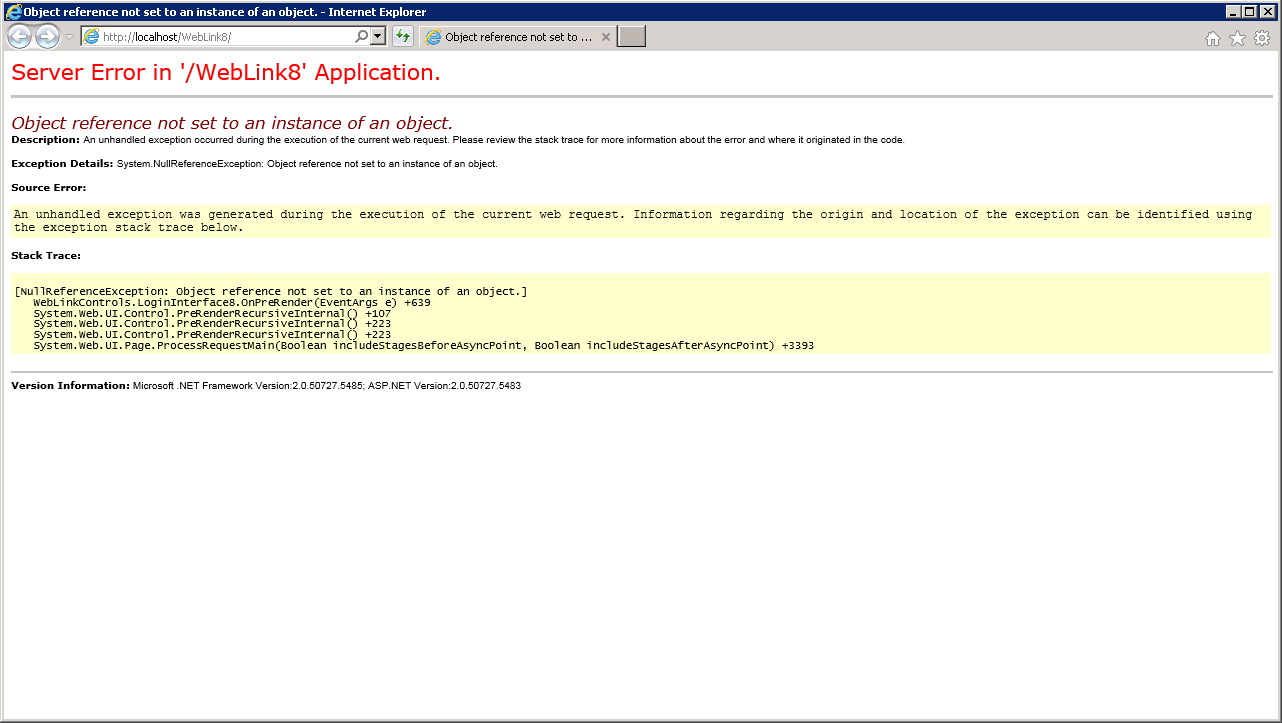 When trying to access the http://<servername>/weblink8/ link I receive an HTTP error 500.19. The error points to a duplicate instance of adding the Welcome.aspx page to the default documents(located in the web.config for Weblink, see screen shot). Upon removing this entry from the web.config I receive an "Object reference not set to an instance of an object" error when trying to load the page(see screen shot). Trying to access http://<servername>/weblink8/login.aspx or http://<servername>/weblink8/welcome.aspx results in the same error.