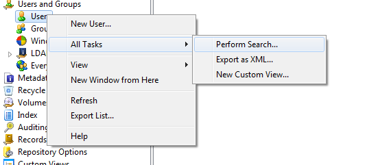 Thanks Justin, unfortunately I'm not seeing this in the administration console when I right click on the user node. when I right click and look at all tasks it only has export xml, new custom view, and perform search.