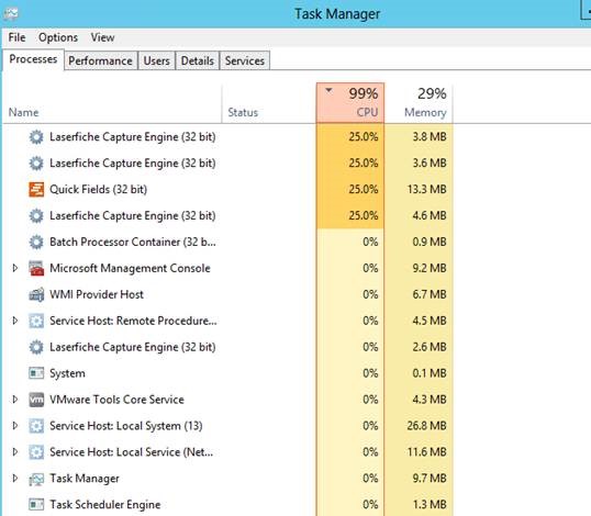 So if you follow that logic, 3 cores is usually sufficient because the 3rd core is your OS and other overhead. Since your screenshot shows 2 cores that's probably what's happening. Outside of the OCR process QF doesn't tax the processor too much as long as you have it installed on a local hard drive (not on a network hd, it can thrash a network connection with all of the file writes it does temporarily).