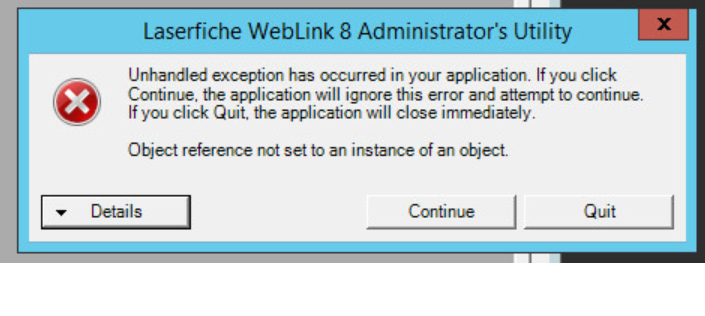 Installed WebLink 8.2.2 on a Windows 2012 64Bit server. When Admin Utility is launched to configure, its generating the attached error messages. Not able to configure. Any suggestions?