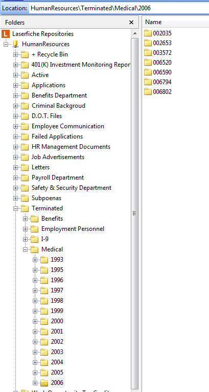 We have been utilizing QF 9 in my department since approximately March of this. Prior to that, everything was being scanned through LF. Now, we are getting ready to scan some medical term employee folders. My problem is this: This particular folder in LF is set up as folder (medical), folder (year), folder (employee no.)Please see attached snip-it. Everything else I have scanned through QF 9.was the document which went directly to one folder: LF client folder, (workman comp), folder (year). When I scanned the documents through QF, they went directly to the year I set the folder path in QF.