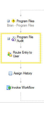 I have attached a screen shot of a portion of the business process - there are several of the same branches that just route to different managers. When a file is tagged for audit a shortcut is created in one of the manager folders. It hangs out there until the manager checks the file and then it moves along to another workflow.
