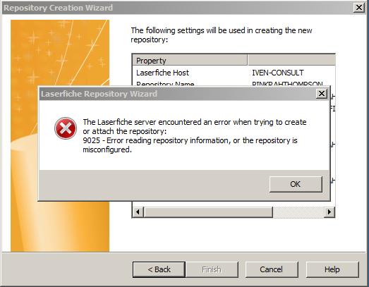 When using the LaserFiche Repository Creation Wizard we are encountering the error "server encountered an error when trying to create or attach the repository".