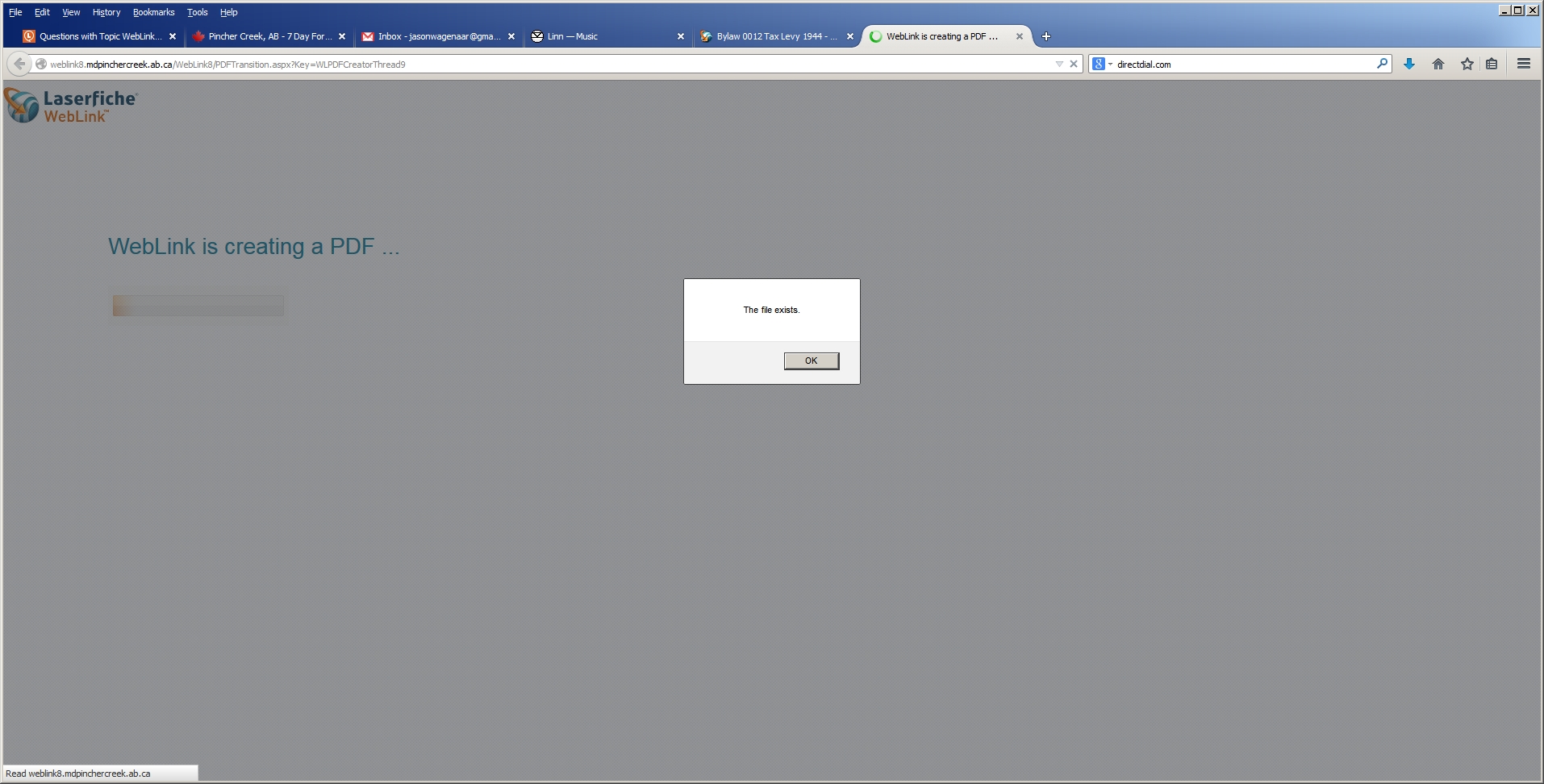 When a user tries to "Print (as PDF)" from within the WebLink (vs. 8.2.2) interface, they get a popup window with the following message, "The file exists". When the user clicks on the OK button of this window, the message goes away the WebLink page displays as normal.