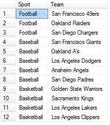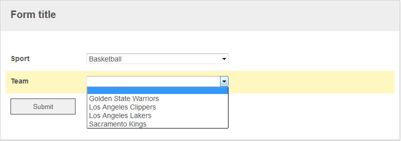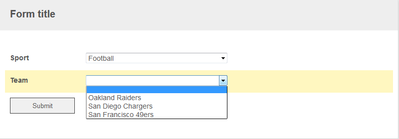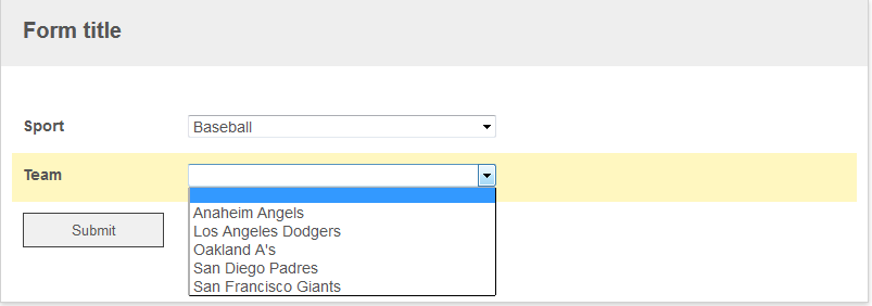 Fill the "Sport" drop down field with the values from the "Sport" column in the database table. Then when the "Sport" that gets selected matches the "Sport" in the table, fill the "Team" drop down with the values from the "Team" column in the database table. The result looks like the following