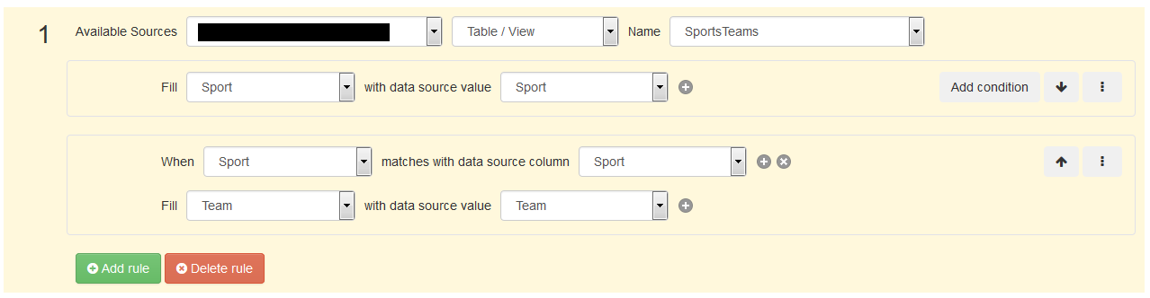 On my form, I have two drop down fields: one for the sport and the other for the team. This is how I would configure the lookup rule in Forms