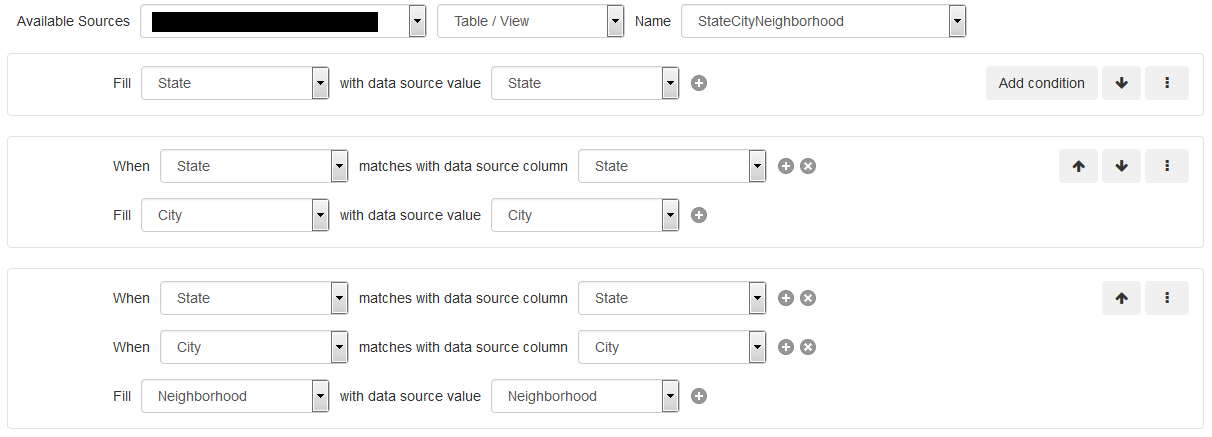 Here's an example of a three-tiered dynamic field configuration in Forms for selecting a state, city, and neighborhood.