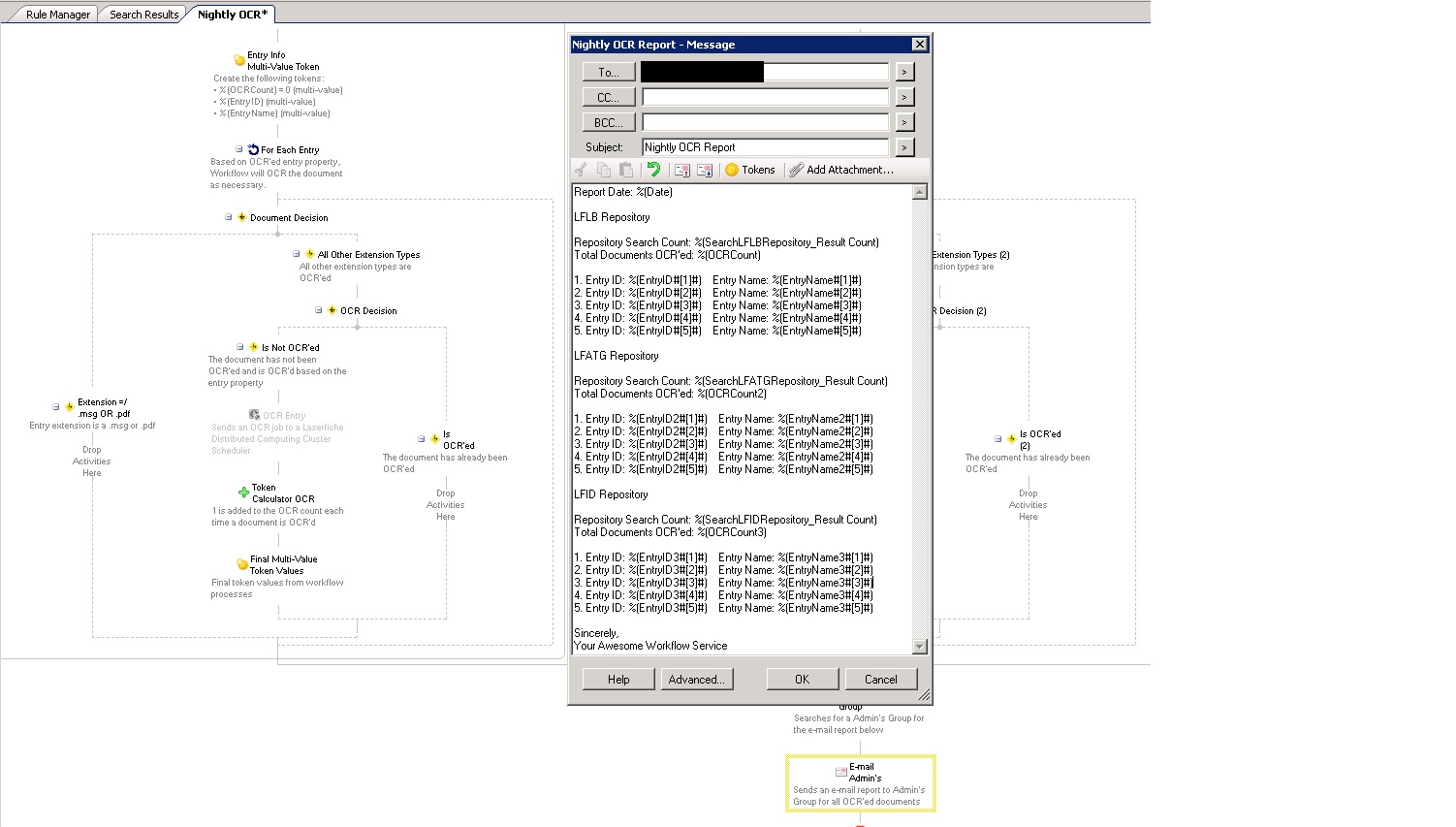 I have a workflow set up that does a nightly search on several repositories and OCR's any documents that are not OCR'ed. I send a nightly e-mail report with the number of documents OCR'ed. I would also like to include a list of the Entry Names and Entry IDs of the documents OCR'ed. I have successfully created the workflow that retreives the entry information in a for each loop and appends the token variables. However, after I call over 10-12 appended token variables in the e-mail activity, the workflow will take a very long time to validate, publish, and run. If I call above 20 appended token variables, the workflow will not validate and publish at all. I need to call anywhere from 100-400 appended token values. Is there anyway I can configure this more efficiently or anything I can do to fix this issue? See the screenshots for more information.