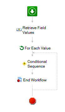 The intention was to hardcode each document type in the For Each Value. When a new document is created, you run the workflow on the container folder. Then inside the conditional sequence you compare the contents of the folder with the Current Value of the loop. The retrieve field values isn't actually necessary I realized.
