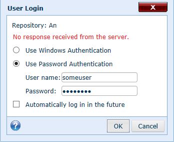 Whenever I try to log in to a repository from the web admin console, no matter how I try to log in, I always get a "no response received from server" message.