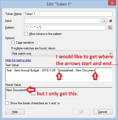 This will work even if your input does not contain the date, or if the date is formatted differently (such as with hyphens). The only constraint here is that it uses the last two hyphens are delimiters, starting from the end. That is, it assumes that the text you want is indicated by the finding the second-to-last hyphen and starting there (and going until the end). It also means that if the second-to-last word is "Spread-sheet", or if the document name is "New-Document" or something, that this won't work. But you have to define *some* kind of rule for the patterns to work anyways =). Oh, it also assumes that this is the whole input. That is, you're not finding this in a bunch of text, but rather you are given this input and you are running pattern matching on this whole Test Value as though it were the start-and-end of the input. You could always do a pattern match to capture this particular text and then perform these steps.