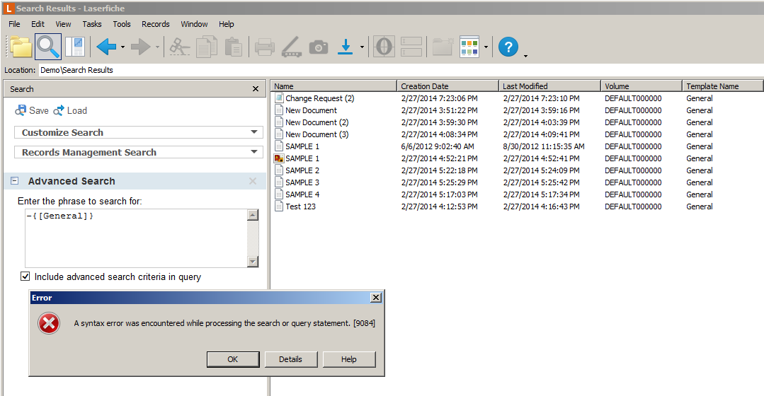 to your search syntax to have it exclude entries assigned that template. For example, I want to find all entries with names that start with "sample" and I want to exclude the ones that are assigned the General template. My advanced search would look like