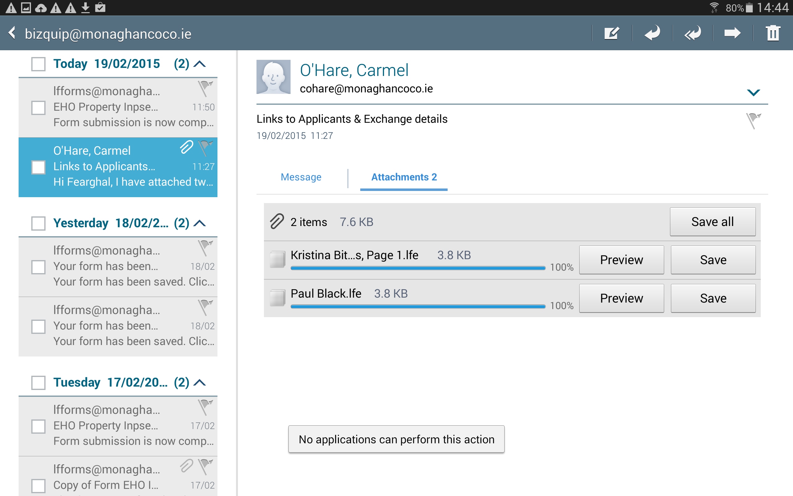 Has anyone else had this issue with .LFE links sent by email to a LF users not opening in Android 4..4.2 on Samsung? We can download the .lfe files and open with the Laserfiche App but clicking on the link (attachment) on the emails can't find the App? Tried two email clients (native & outlook) but no success.