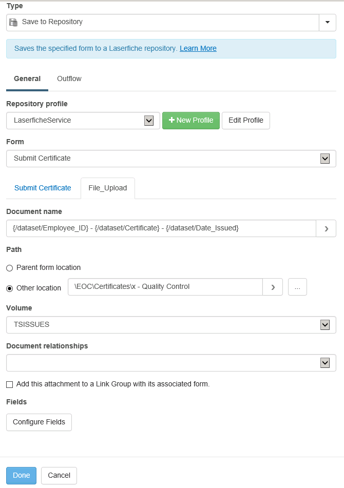 I have a form in Laserfiche forms that allows for a file upload. It is attached to a template with metadata mapped to the fields on the form. Once it is stored inside Laserfiche the metadata and template are no longer attached to the file? Any ideas? Occassionally it will bring the metadata/template in but more often than not it is all missing.