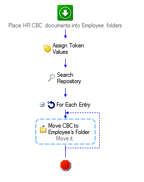 This business process places a document into a specific folder within the employee’s folder. The document’s name is the same as the name of the Employee folder and is also the name field in the “HR Employees Folder” template. The BP creates %(EmployeeFolderName) to hold the document name. That token is used to find the employee’s folder with the following template search: