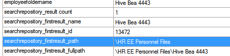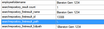 When the BP executes to place Gern’s document, %(SearchRepository_FirstResult_Path should equal \HR To Be Processed\Form 500\Blanston Gern 1234 but instead, Gern’s folder is not found …. SearchRepository_FirstResult_FullPath=\ ….and a new folder is built for Gern in the root.