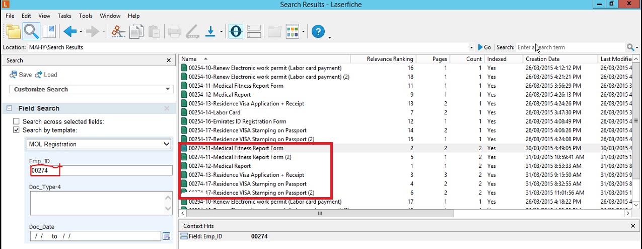 i am facing a problem with the Search Result when i try to search documents using Template & when i pass the paramter to field for example " Emp_ID = 00274" system shows mualti results like "00254, 00274,00294". for more information i am attching screenshots .