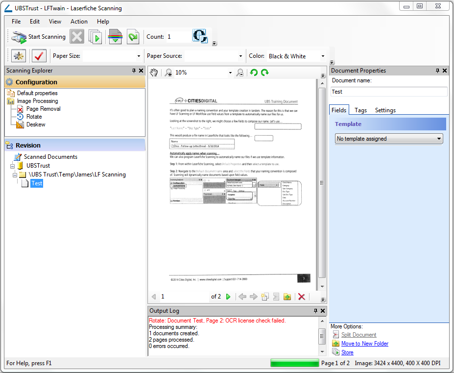 I have attached a screenshot showing the message I get in the output log. For your reference we have Laserfiche 9 and I am using an old scanner a Fujitsu fi-5650c.