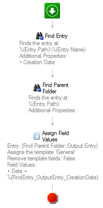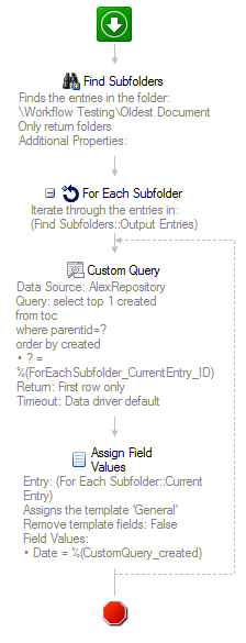 The idea is that you use a "Find Entries" activity to get all the subfolders. Next, using a "For Each Entry" activity you can use a custom query that finds the oldest creation date of a document in that specific subfolder. Then you assign that date value to a template field on the subfolder. The looping just processes this for each subfolder.