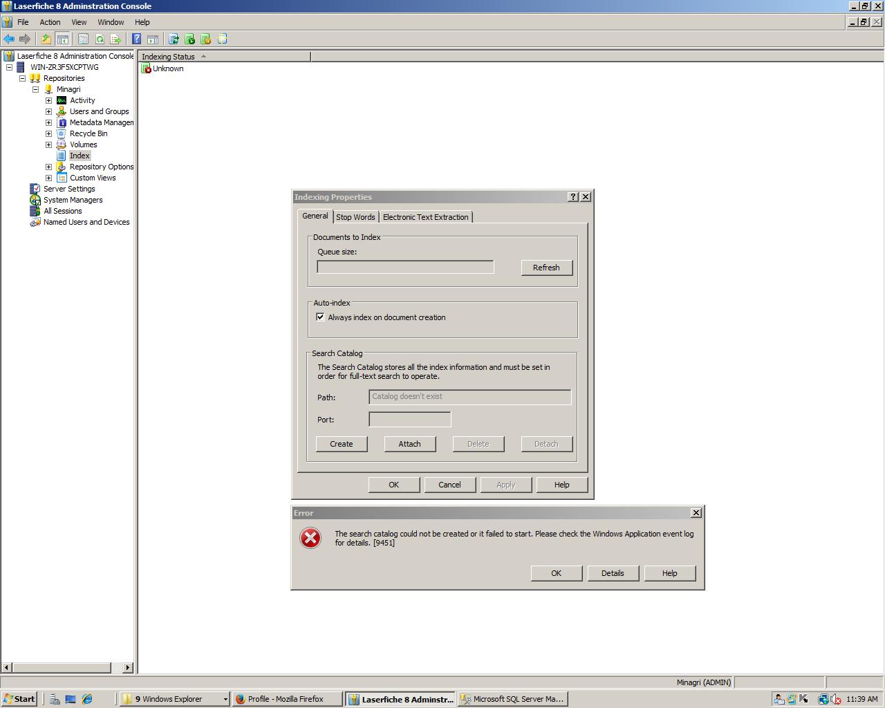 hello after reattaching my repository something is going wrong I can't do full text search.some one can assist me how to Create or attach catalog in Laserfiche 8.2. Error detailed below. Thx