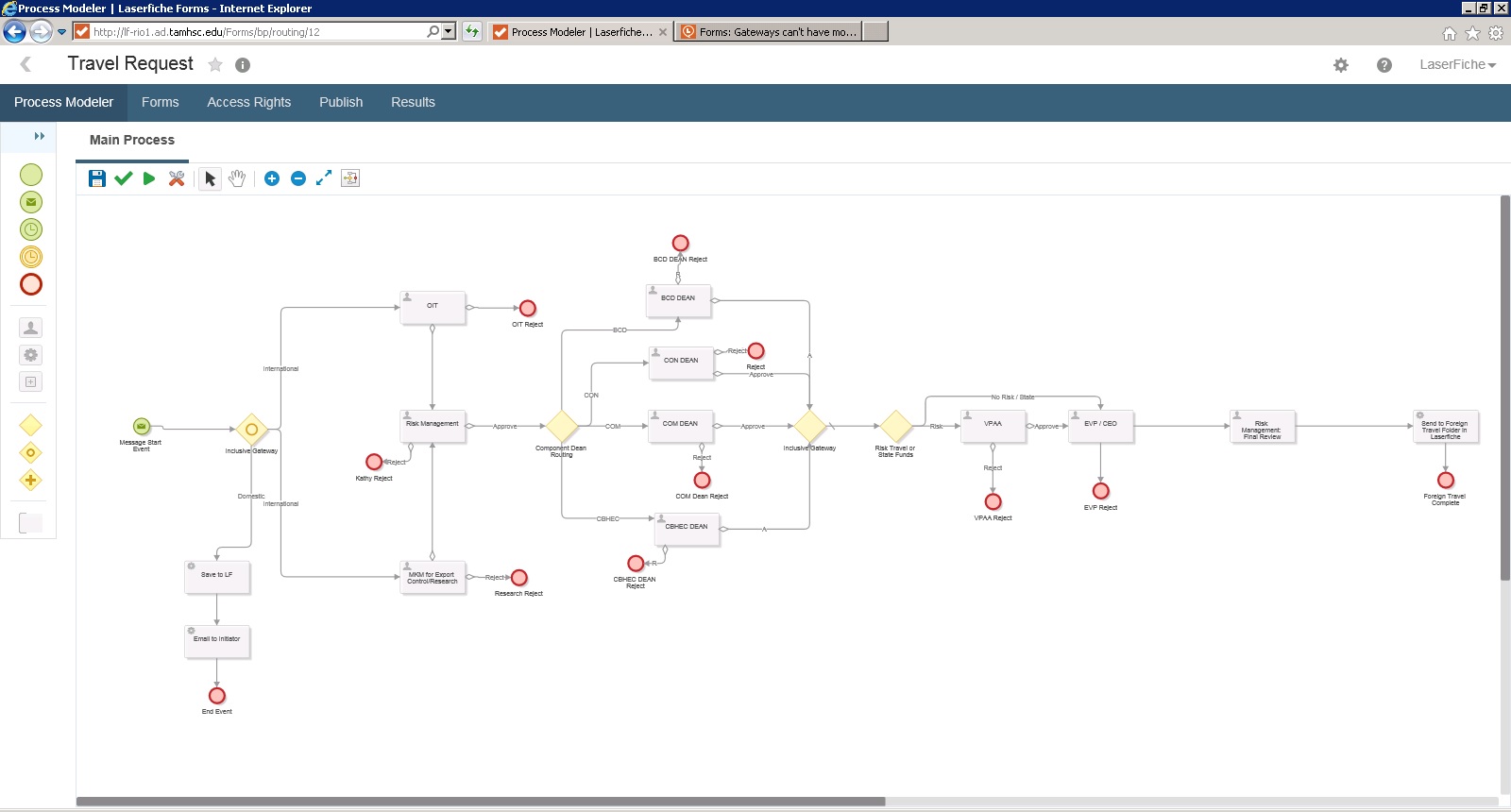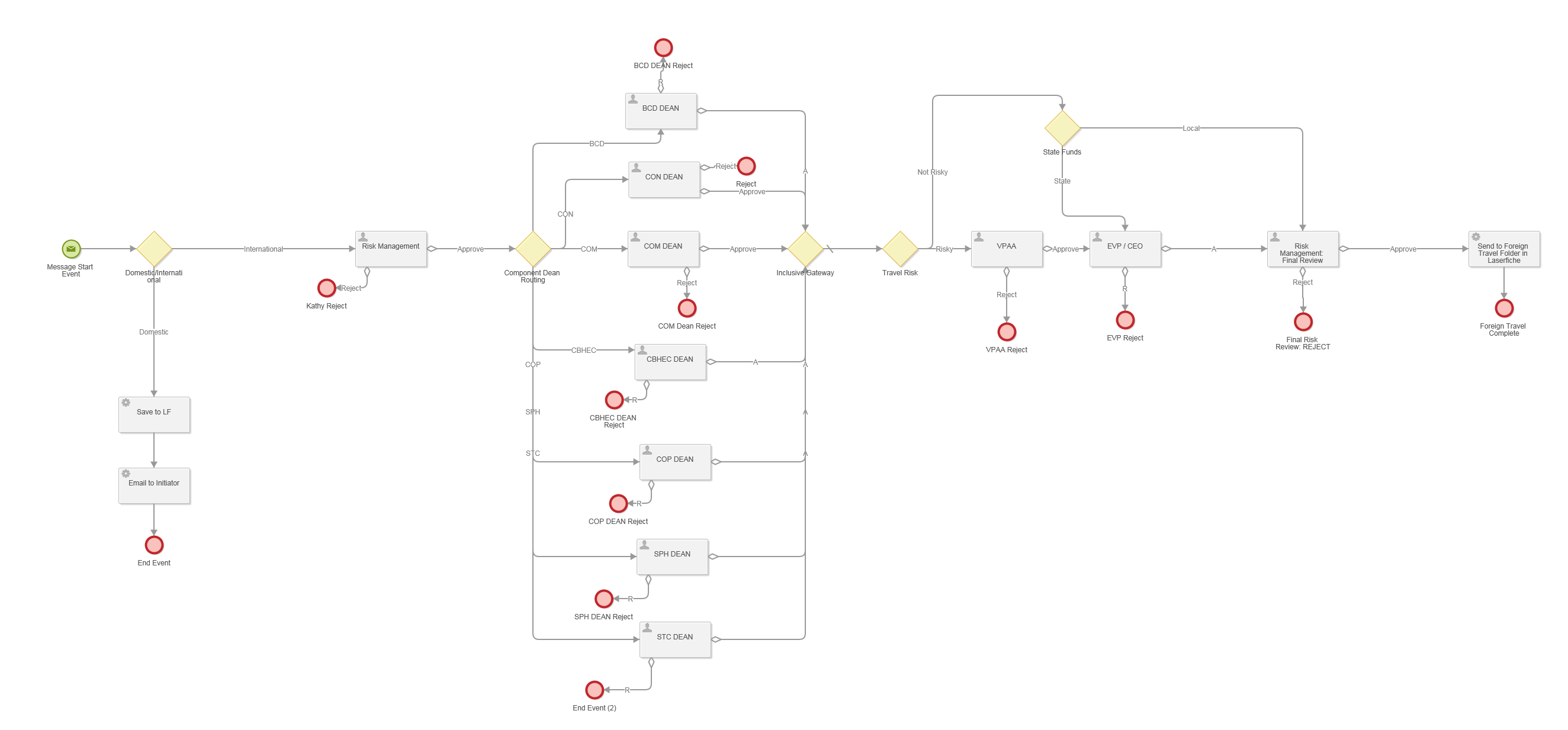 Use Case: Travel Requests are sorted to college deans (8 deans) for Approval [ User Tasks ] After those Deans approve, if it is international Travel (Exclusive Gateway] it needs to be routed to the Risk Manager for Approval; if Domestic, then send to repository folder.