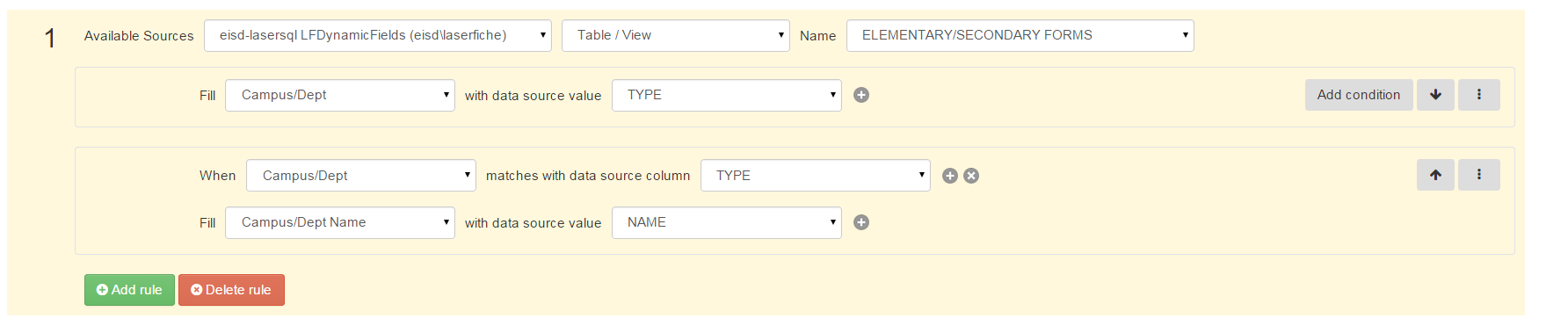 i am having problems when i do a lookup rule on a form. basic table with campus type and campus name. in the lookup rules i set up the available source/table, fill campus/dept type with data source value Type, then add when campus/type matches data source column Type, fill campus/dept name with data source value Name. the Type comes out but nothing comes up for Campus Name. If i do them individually data sources come out but will not link when setting up the lookup rules. any idea how to fix this issue? i attached an example of what im trying to do.