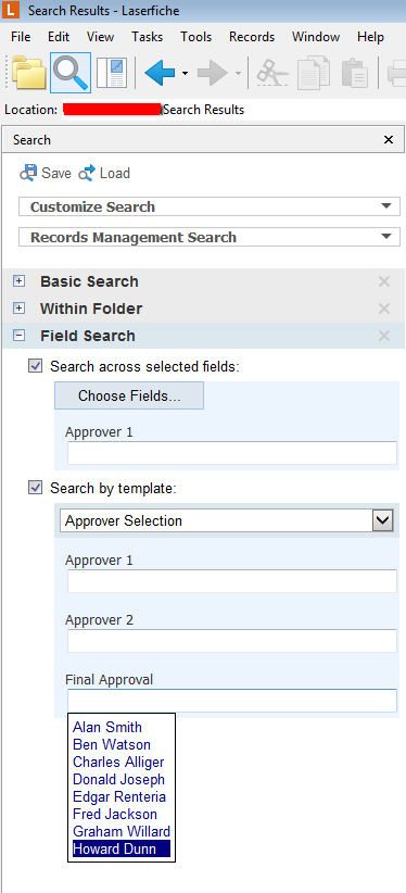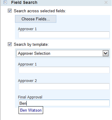 I also found it strange that the "Approver 1" in the field search did not show the list, whereas the fields in the template search "Approver 1, Approver 2, and Final Approver" each showed the list when the field was clicked on.