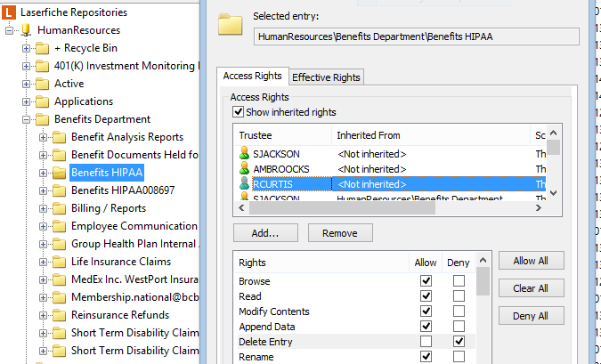 I have a folder called Benefits. I only want this user to see HR\Benefits\HIPPA under this particular folder. I don't want her to have access to any other benefit information except HIPPA. When I open the Benefits\HIPPA and right click access rights it seems I have everything right, but on her computer we can't see it. What am I missing? Any help. See attached. Thanks