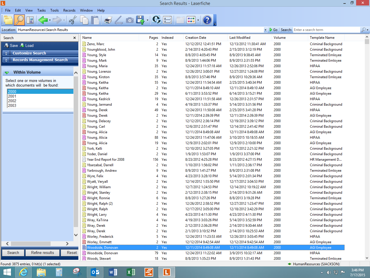 Okay. I have recently been handed the Admin Console in our department (HR). The admin before me has named the volumes by year, but a new year wasn't created when it was supposed to be. In fact a "new year" volume hasn't been created since 2011. Every single document from payroll, benefits, applications, etc. are in these volumes--all mixed together. Our IS department told us a year ago that they are a mess. There are many different documents within the year: payroll, benefits, background checks (see screenshot). Oh, and there are no limits set.