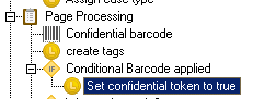 Under the Page Processing step, I am looking for this secondary barcode (if it exists), then I have a couple Conditional processes to see what secondary barcode was applied. If we have a winner, I'm setting an aptly named token (confidential and restricted, respectively) to true.