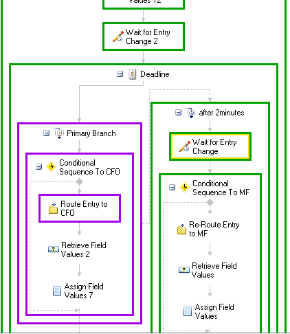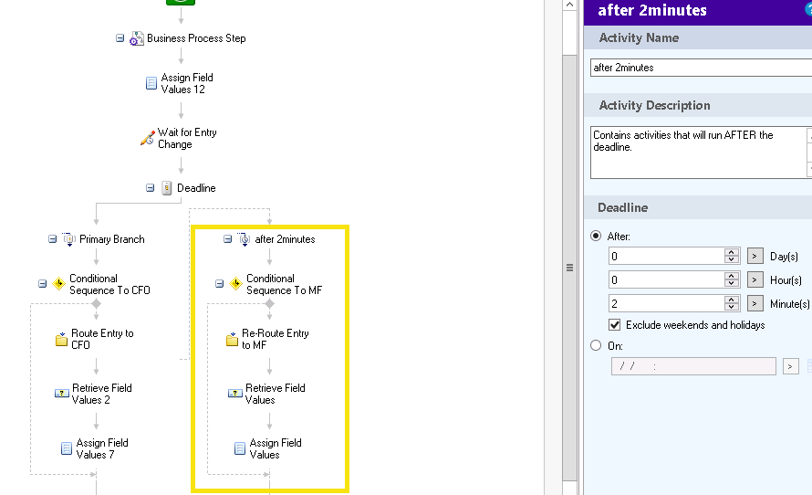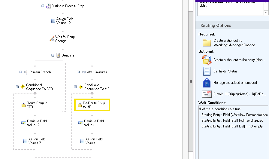 I have a workflow where I have to cater absence of users. The document should be routed to someone else. I have tried the deadline activity where after 2 minutes if the first user did not action the workflow routes the document to someone else. The issue that I am having is that after 2 minutes my shortcut disappear from the first user folder but did not show up in the second one. Do I have to add a wait condition ? if yes, where?