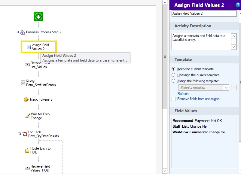 Please see screenshots as attachments. The first one includes the activity name 'Assign Field Values' and the second one is the Query Data activity name.