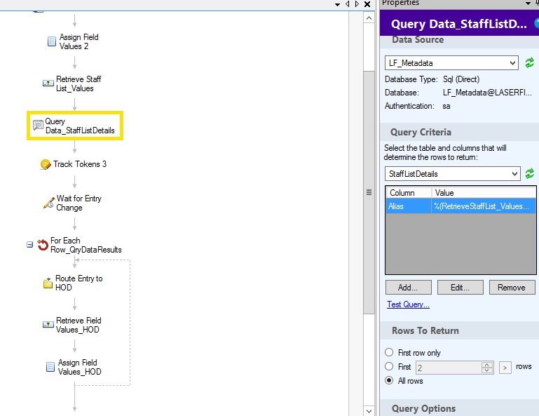 I have a workflow which needs to query for values (i.e Staff Name) from a MS SQL table. From the screenshot, when starting the Workflow, there is a field Staff List which needs to be populated dynamically according to the Staff Name results from the SQL table. I am getting an issue where the Staff List is not being populated and returning no results. I tried to test query and it is said '0 row(s) affected'