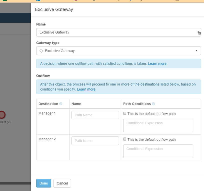 OK details are very basic, pictures attached. Basically look at Gateway 1. You have your Gateway, and what happens when a drop down is chosen (Gateway details). I work backwards and create the user tasks, and the forms (or approval) for each outcome. Once that is completed, you configure your gateway. On the Gateway details, under Path Conditions, there is a tool bar that allows you to chose what condition chose which Path. So you can say, if Drop down A is this Manager, go to Manager 1, on the next condition If Dorp Down is is Manager 2 Go to Manager 2.