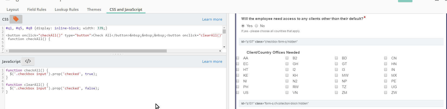I had a requirement for a "check All" checkbox to be added to the actual checkbox. The attached code will check / uncheck all checkboxes depending on the state of the last checkbox "#Field2-3".