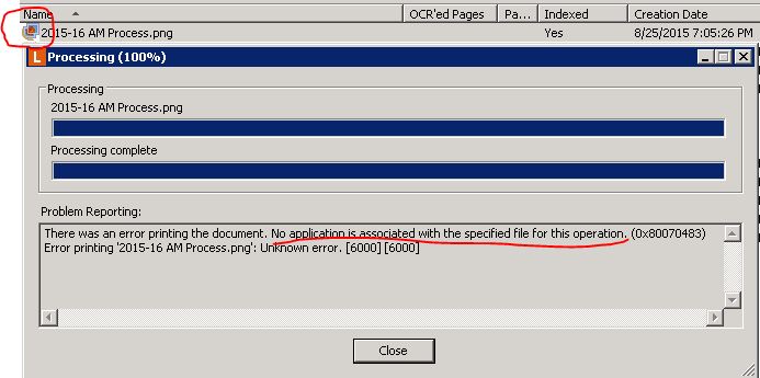 In one of our pc with Laserfiche Client 9.2 (Avante Server), 'Generate pages' command for files with extension of ".jpeg" gets error of "No application is associated with the specified file for this operation. [6000:0x80070483] [6000]". It is OK with files with ".jpg" extension. This occurs only in this specific pc and all other PCs have no problem in 'Generating Pages' with "jpg" or 'jpeg" extension files. Those jpeg files were imported through an SDK application for syncing LF with a certain Windows folders.