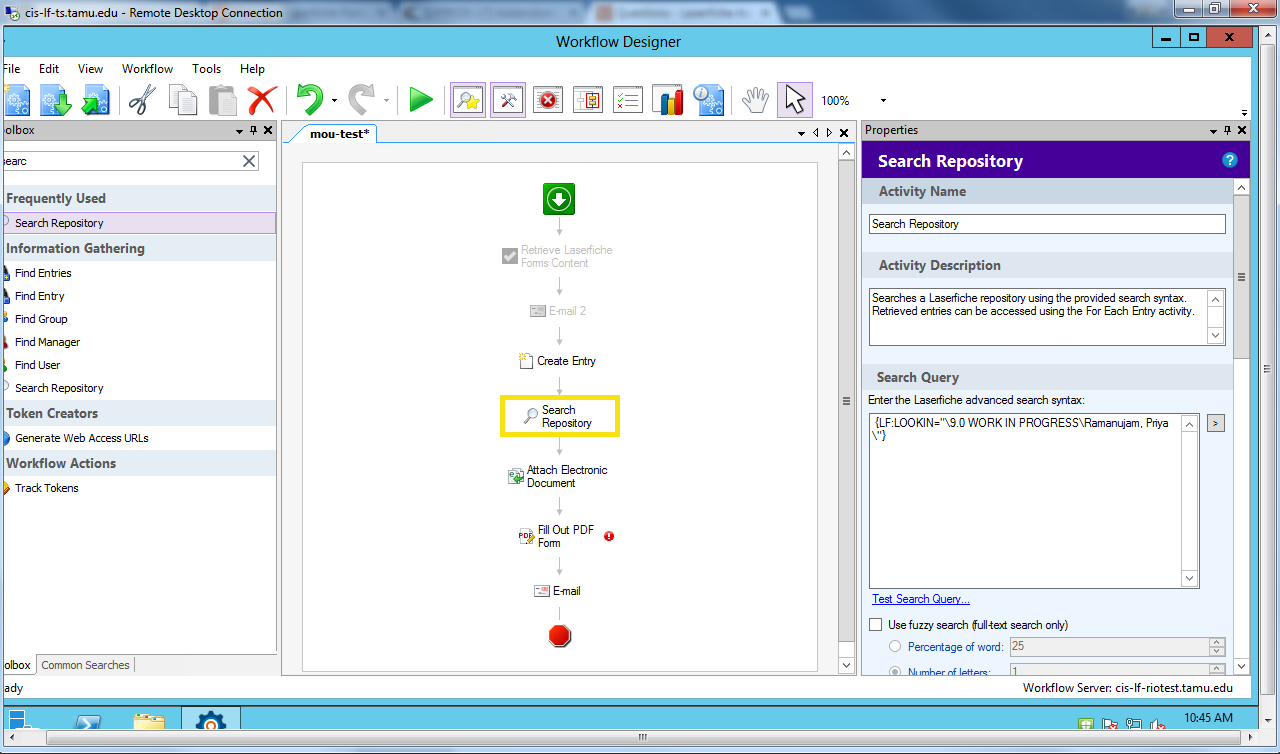 I am trying to use fill out PDF activity in workflow. My PDF is located in Laserfiche Repository. I use Search Repository activity to find that PDF. However, in the Fill out PDF activity, how do I choose that PDF that I searched? It is not appearing in the drop down. Any help is appreciated. Please see attached the screen shot.
