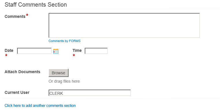 When the first staff member reviews the submission, they are looking at the 2nd form (it includes the read only version of the first form). They can make comments and if they have more than one comment they must click "add another comments section" which duplicates the collection.