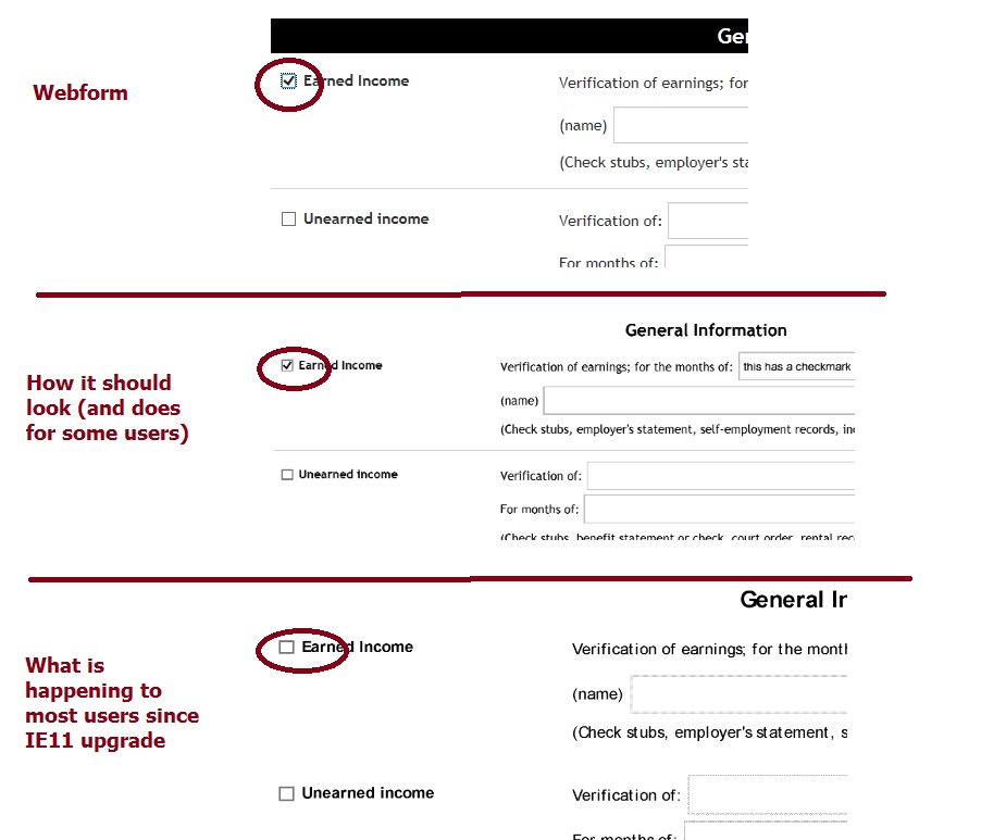 We have a webform that users Snapshot into the repository. Since upgrading to IE11, when this form is Snapshot in, it no longer renders the checkmark boxes correctly. IE11 does not have a Print As Image option like Adobe does (and this is a webform, not a PDF) - wondering if there is a Snapshot Properties or Preferences option that will make the checkboxes print when Snapshot in? This issue is affecting some users since the switch to IE11, but not all users.