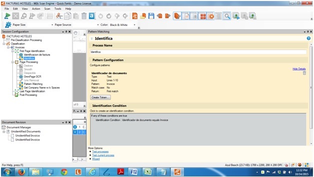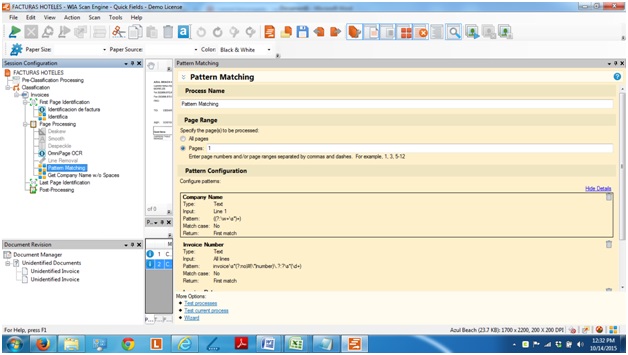 I have a Quick Fields session that extract Invoice number and Customer name, with the first page identification set to patter matching to extract the word INVOICE (for the first 10). When we retrieve the documents from the repository the session works fine, but when we run directly from the scanner we get the message “Cannot find property.” And the session does not identify the document.