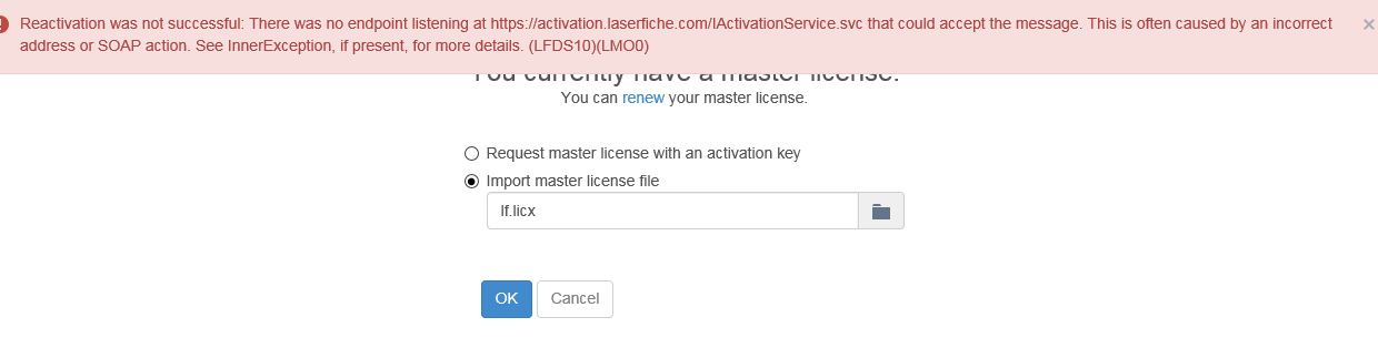 Our vendor send us a license file to add but when I try to renew it it is showing as if is trying to contact the Laserfiche activation webservice.