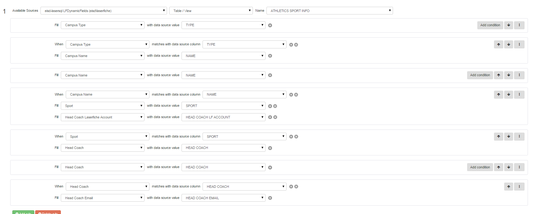trying to figure out the lookup rule for the following fields. i have campus type (high school or middle school), campus name, based off of campus type and campus name sports should populate, and based off the sport you select head coach name, email, and laserfiche account should populate. so far i have gotten the majority to work but when selecting "sport" all coaches for that sport populate. is there a way to separate that and only have it populate to their designated sport? in the database i created the columns that are included are type (high school or middle school), campus name, sport, head coach, head coach email, and head coach laserfiche account. all sports associated with the campus and campus type are in separate rows. i have uploaded the current lookup rules i currently have in place in the form.