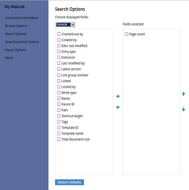 WebLink allows you to add columns, like the creation date and last modified date, to your search results. To customize your search results, click My WebLink at the top right of the page and select Search Options on the left.